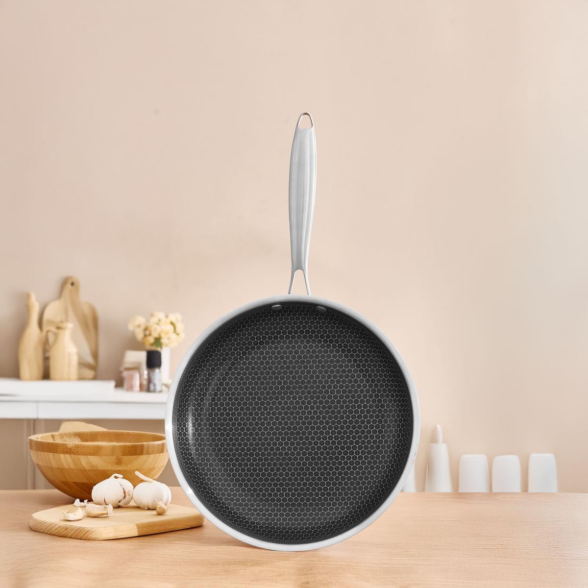 Alliez performance, durabilité et design avec la collection BlackSteel triplex. Conçue en inox 18/8 avec un corps triplex, cette poêle assure une répartition homogène de la chaleur, du fond jusqu’aux parois, pour une cuisson parfaitement maîtrisée. Son intérieur est revêtu d’un antiadhésif céramique haute performance, sans PFOA ni PFAS, pour une cuisine plus saine et un nettoyage facile. Grâce à la technologie BlackSteel, composée de micro-points en acier inoxydable aux formes géométriques uniques, le frottement des ustensiles est réduit, préservant ainsi la surface antiadhésive et prolongeant sa durabilité. Pensée pour répondre aux exigences les plus élevées, la ligne BlackSteel de Laguiole est le choix idéal pour les passionnés de cuisine à la recherche de qualité, de précision et d’élégance.